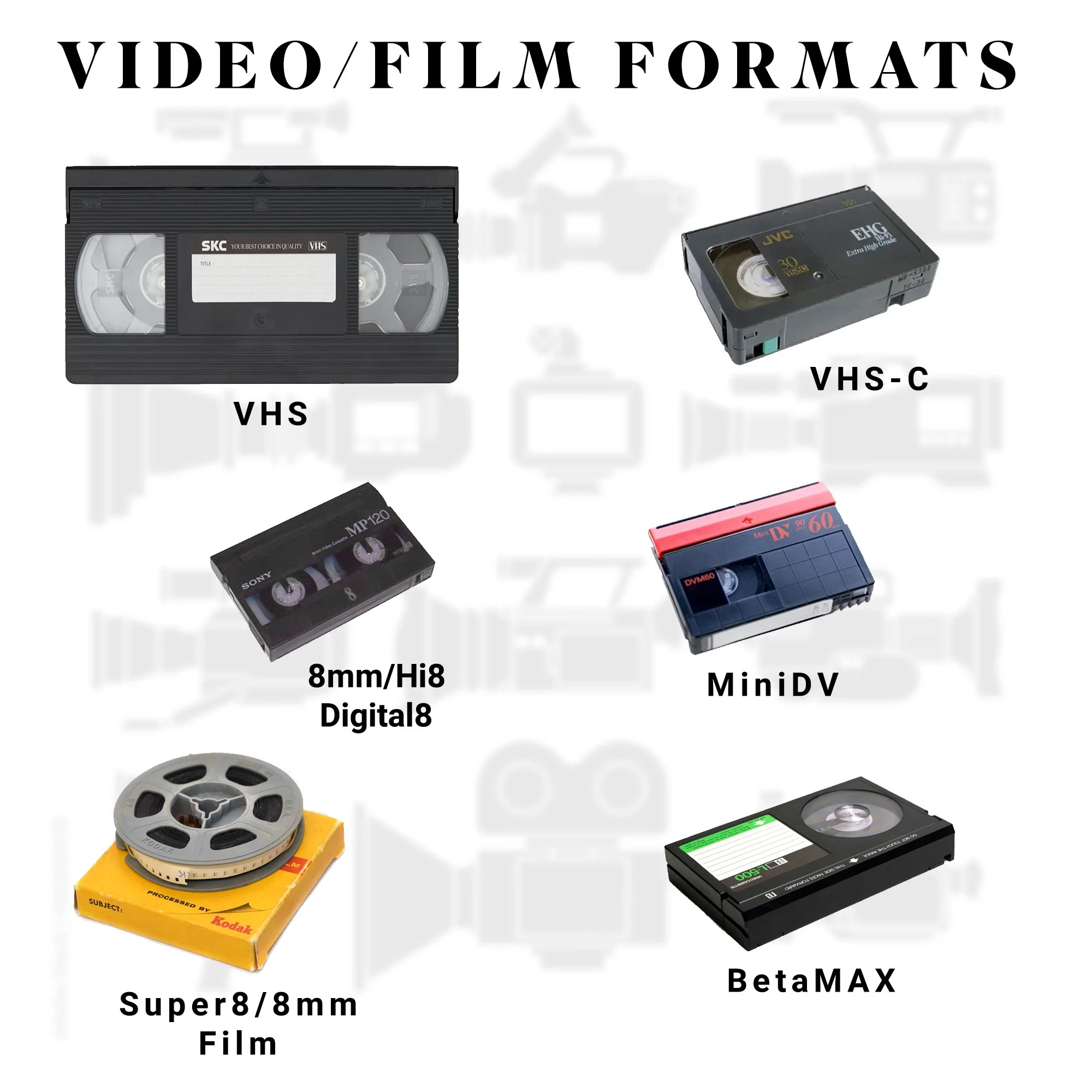 Let’s get started Ready to get those memories back? Just fill this out and we’ll get you a quote to get everything started. See image for an illustration of some different tape types. Name * First Name Last Name Email * Phone (###) ### #### Click this if the following options are confusing and you'd just like us to contact you about your videos/films: Just contact me! Tell us about the media you would like digitized: Video Formats (see pictures for help identifying) VHS (includes VHS-C) Video 8mm (includes Hi8, Digital8) MiniDV (includes HDV) Betamax DVD (includes MiniDVD) Total # of video units: Film Formats Super8 Regular 8mm 16mm Total # of film units and sizes: Photos prints slides negatives Total # of photo units: How would you like final files delivered? thumbdrive dvd blu-ray Cloud Streaming Message * How did you hear about us? Facebook Web search A Friend Other Thank you! We can’t wait to help you bring back those memories.